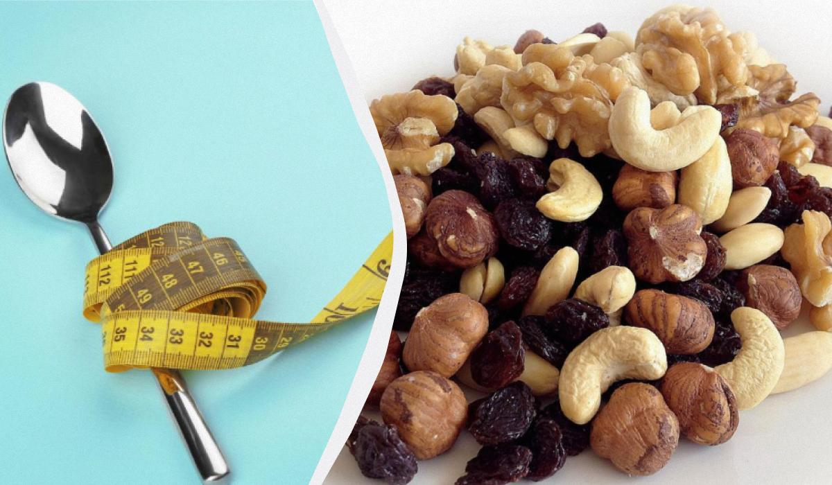 Een mengsel van noten en gedroogd fruit is een van de producten die met voorzichtigheid moeten worden geconsumeerd tijdens het afvallen / collage door My, foto door depositphotos.com, pxhere.com